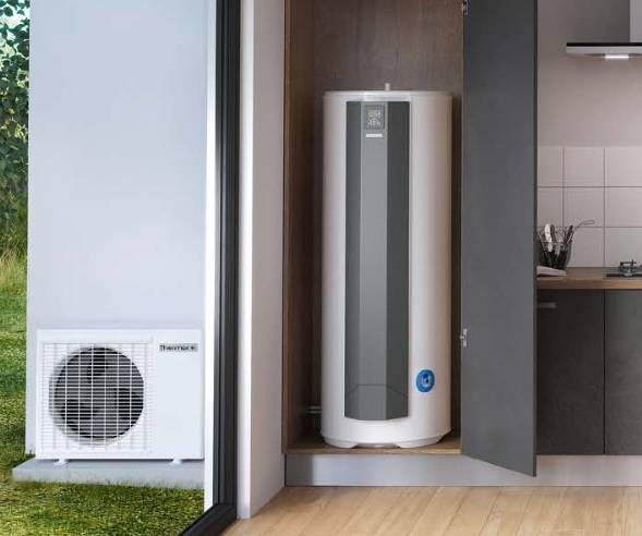 bi-bloc, avec un Ballon ECS stocké dans un local chauffé et une Unité Extérieure pouvant être installée au mur, ou plus généralement dans un jardin. Il existe un modèle mural de 200 litres et un modèle stable de 270 litres.